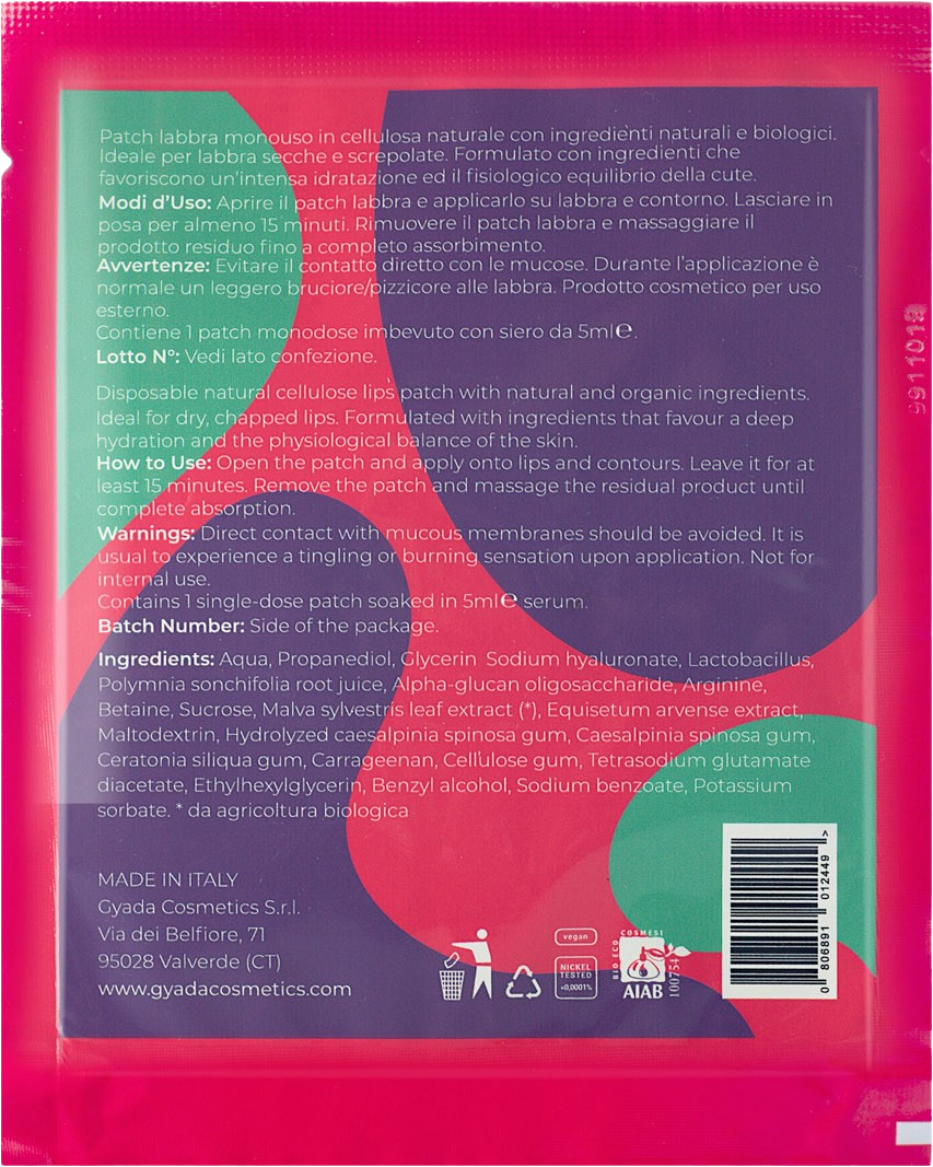 Dit masker is ideaal voor droge, gebarsten lippen die extra hydraterende en regenererende verzorging nodig hebben. Het is samengesteld met geselecteerde ingrediënten, zoals een hydraterend complex, een pre-probiotisch complex, hyaluronzuur en paardenstaart, die de tere huid intensief hydrateren en het fysiologisch evenwicht bevorderen. Het masker is gemaakt van natuurlijke en biologisch afbreekbare cellulose.