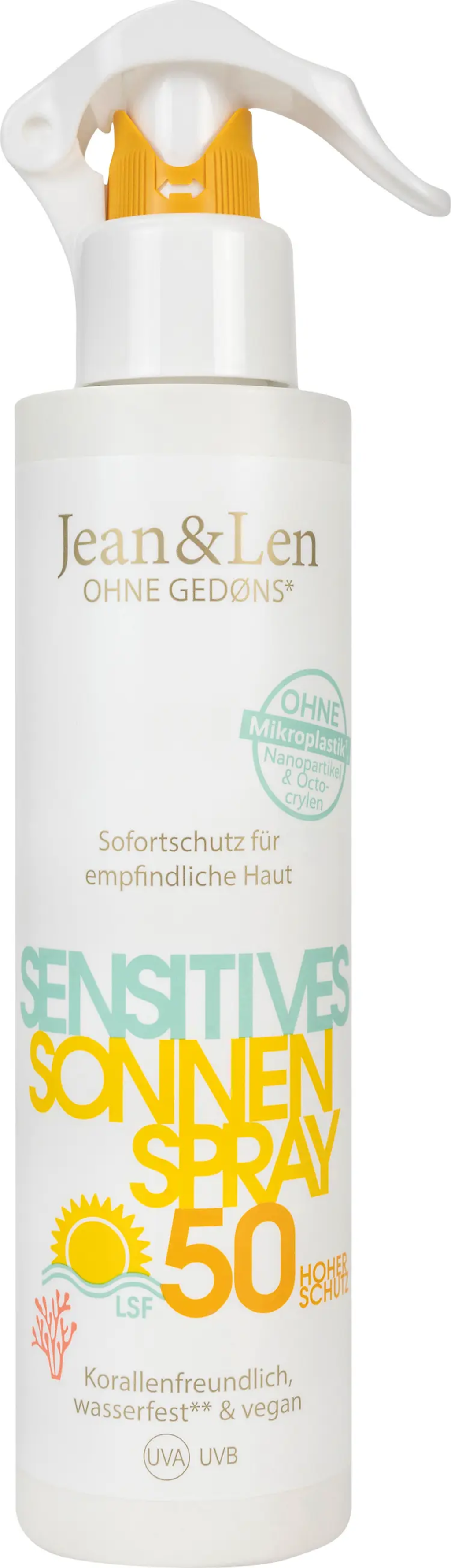 Bescherm je gevoelige huid effectief tegen zonnestralen, maar vermijd onnodige ingrediënten voor het milieu! De Sensitive Zonnebrandspray SPF 50 van Jean&Len beschermt je huid op betrouwbare wijze tegen UVA- en UVB-stralen, maar bevat geen nanodeeltjes, siliconen, parabenen, microplastics, minerale oliën, aluminium, geurstoffen, kleurstoffen, octinoxaat, oxybenzone, oxtocrylene of synthetische polymeren. Bovendien is de formule veganistisch, waterbestendig en in overeenstemming met de Hawaii Reef Act - zonbescherming kan ook werken met een zuiver geweten!