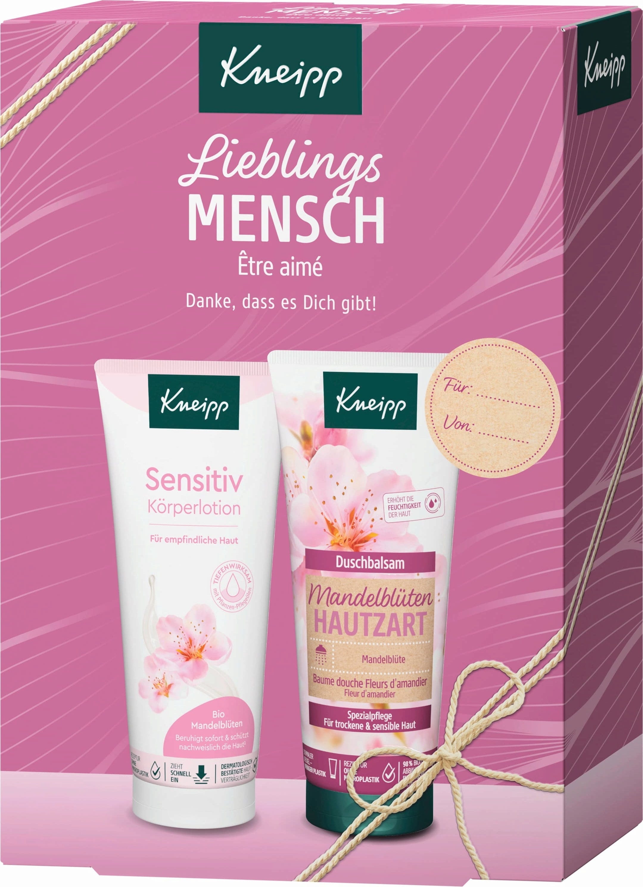 De Kneipp Favourite Person cadeauset is een liefdevol samengesteld verzorgingspakket voor speciale mensen in je leven. Hij bevat een bodylotion en een douchebalsem uit de beproefde en geteste amandelbloesem huidverzorgingslijn - ideaal voor droge en gevoelige huidtypes. De combinatie van kostbare amandelolie en zachte formules zorgt ervoor dat je huid elke dag zacht en soepel aanvoelt. Geef met deze set een kleine time-out vol zorg en dankbaarheid cadeau.