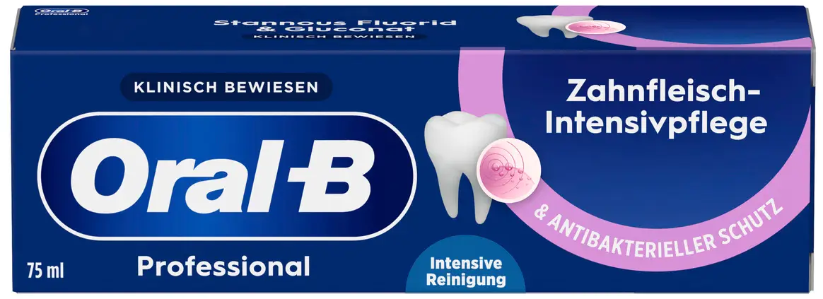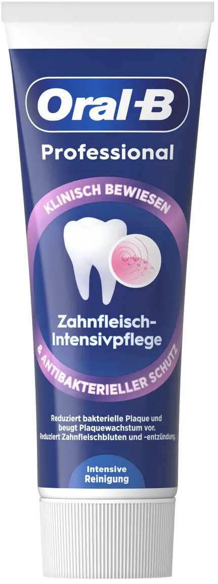 De Professional Intensieve Tandvleesverzorging Tandpasta van Oral-B kan de groei van tandplak remmen met zijn unieke en effectieve formule. Het kan ook de weerstand van het tandvlees verhogen. Voor optimale bescherming van tanden en tandvlees, met de smaak van verfrissende pepermunt.
