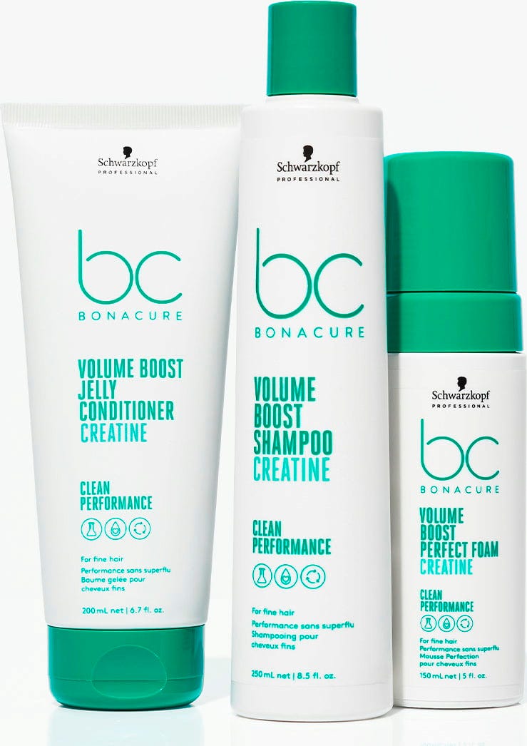 Bonacure Volume Boost Creatine Perfect Foam van Schwarzkopf Professional biedt fijn haar hittebescherming en een volumineus gevoel.