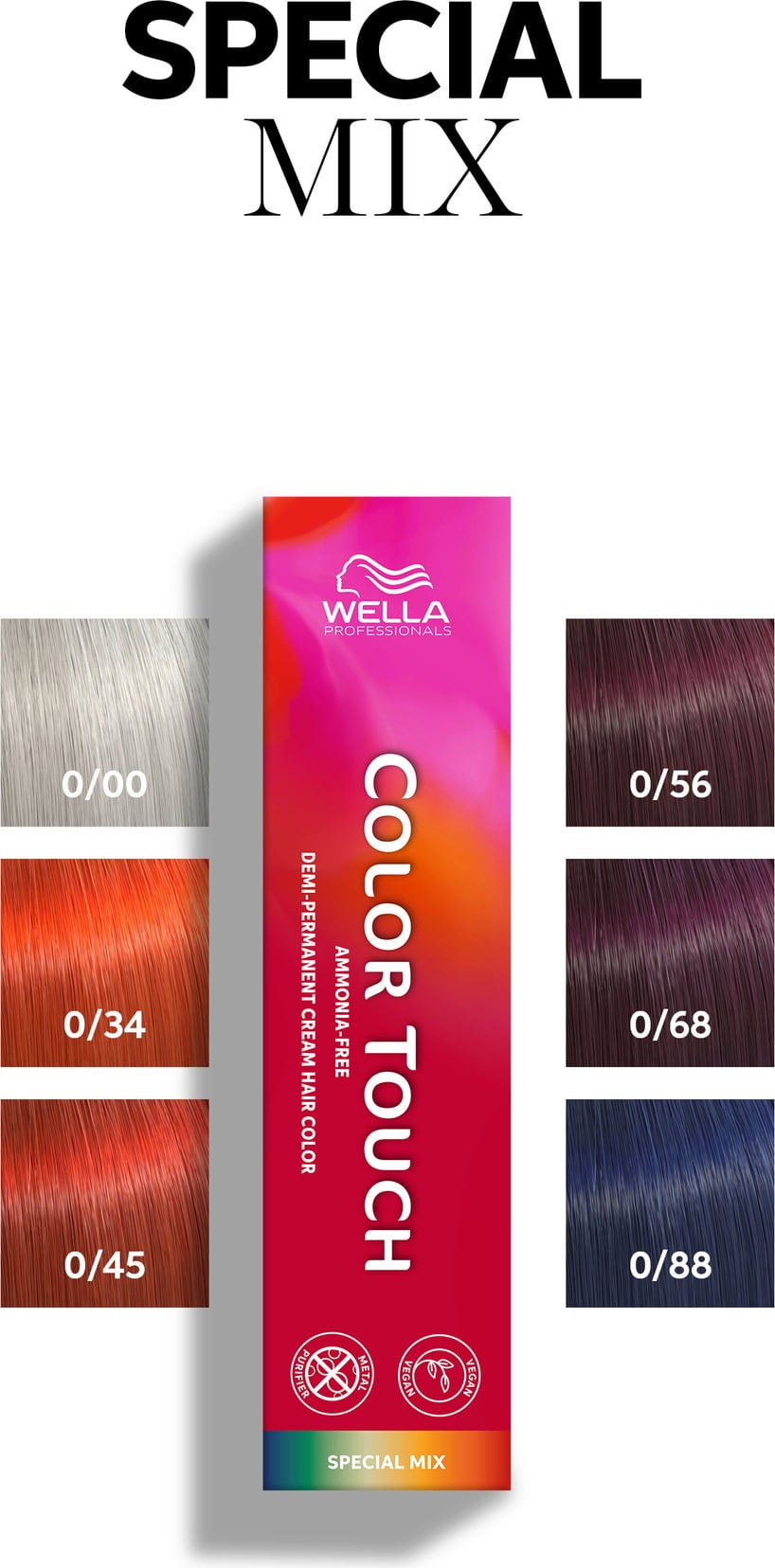 Heb je zin in iets speciaals? Color Touch Special Mix zijn demi-permanente intensieve tinten die je haar een hele speciale kleur geven. Dankzij de Metal Purifier Technology kun je tot 28 wasbeurten lang genieten van professionele kleurresultaten en een stralend mooie glans